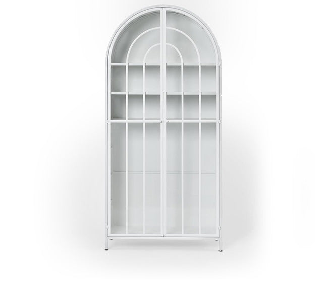 Metal cabinet with rounded arched top in striking white. Glass opening doors metal knobs, 4 internal shelves for storage.