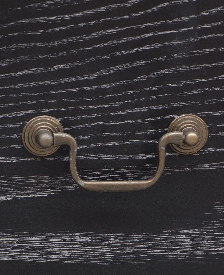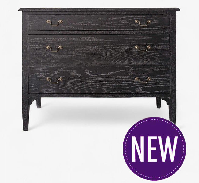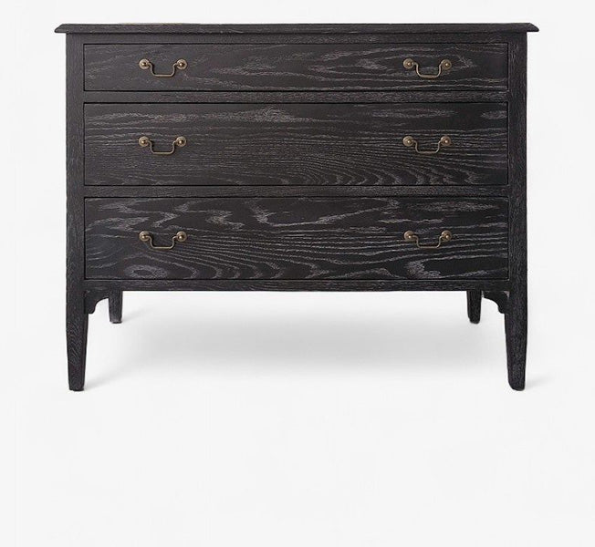 The Burnley Dresser in Ebony Stained Oak is a timeless addition to any bedroom, combining classic design with modern elegance. Crafted from ebony-stained oak with a subtle grey-washed grain, this dresser showcases exquisite craftsmanship and attention to detail. Featuring spacious drawers with iron handles in a brass finish, it offers both practicality and style.